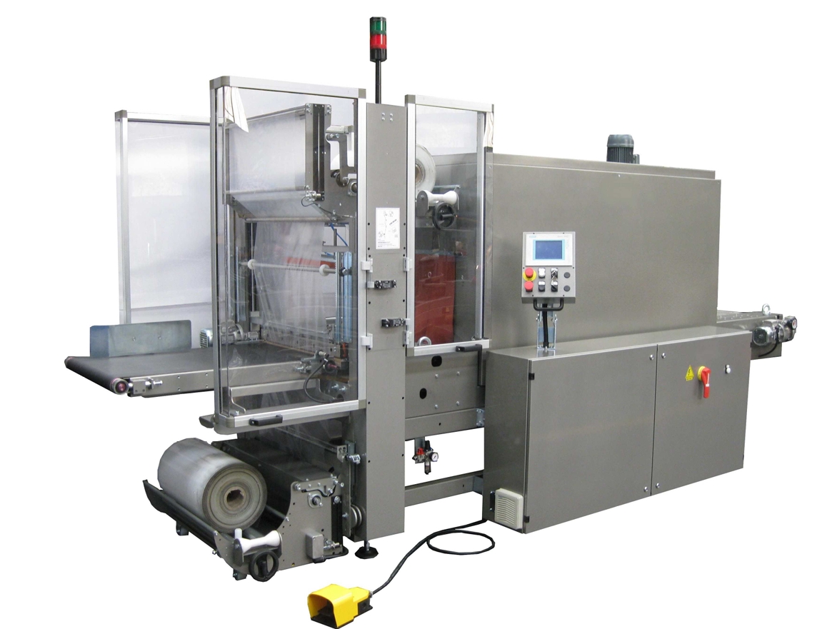 Una máquina de embalaje automática y semiautomática para velocidades de producción medias-altas, con barra de sellado, cinta transportadora de entrada y salida, y túnel de termorretracción, todo integrado en una sola unidad.